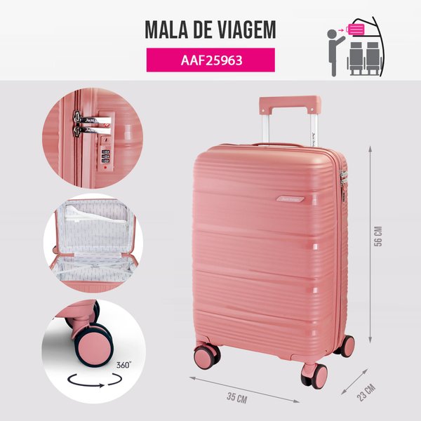 Fabricada em material resistente de polipropileno, a mala garante durabilidade e proteção aos seus pertences, mesmo nas viagens mais longas. Seu design moderno e sofisticado se destaca, enquanto os detalhes funcionais tornam o transporte muito mais confortável e seguro.